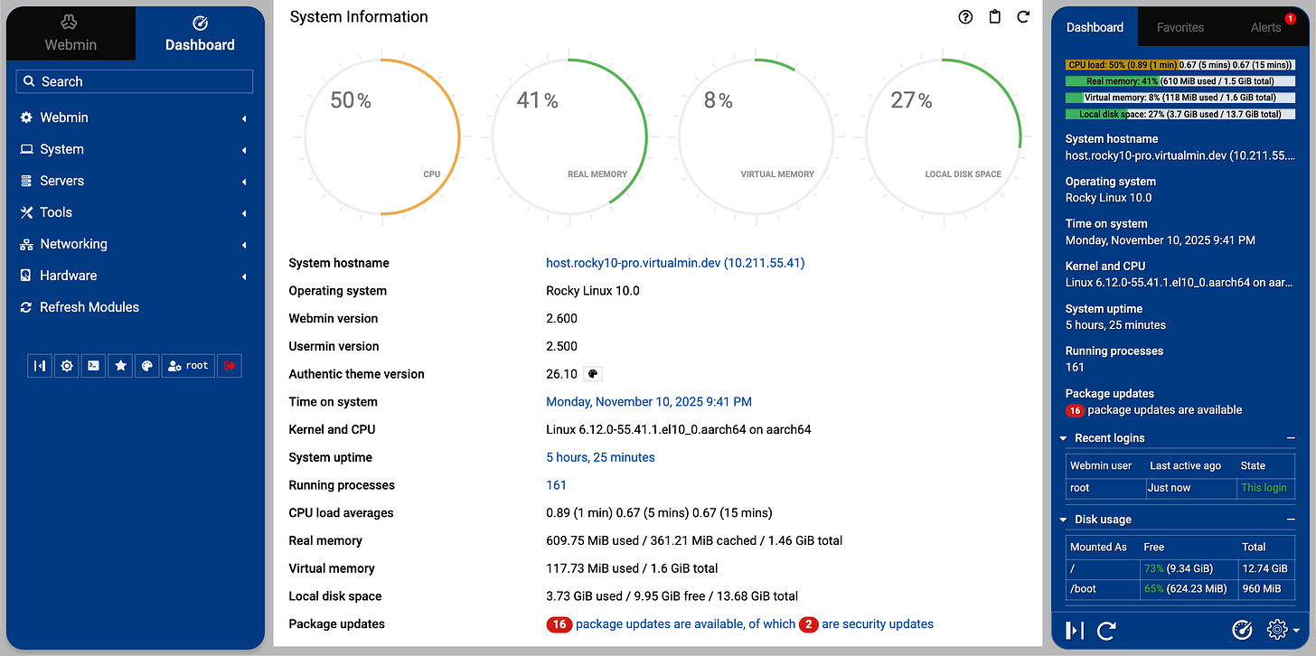 A web-based system administration control panel for Unix-like servers that lets you manage users, services, packages, and configuration files through a browser.
